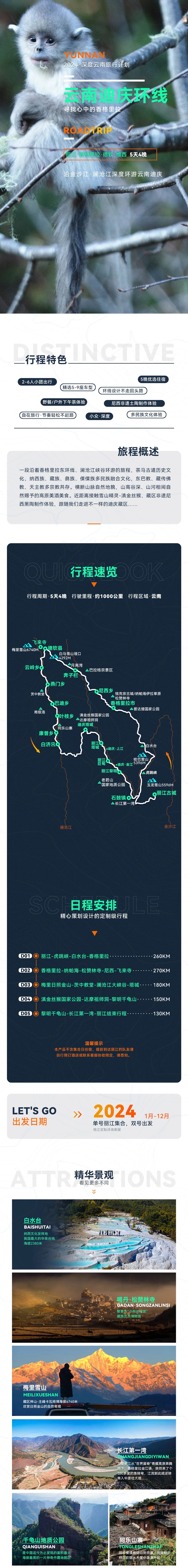 一段沿着香格里拉东环线、澜沧江峡谷环游的旅程,茶马古道历史文化,纳西族、藏族、彝族、傈僳族多民族融合文化,东巴教、藏传佛教、天主教多宗教共存。横断山脉自然地貌,山高谷深、山河相间自然赐予的高原美酒美食。近距离接触雪山精灵-滇金丝猴、藏区非遗尼西黑陶制作体验,跟随我们走进不一样的迪庆藏区....
