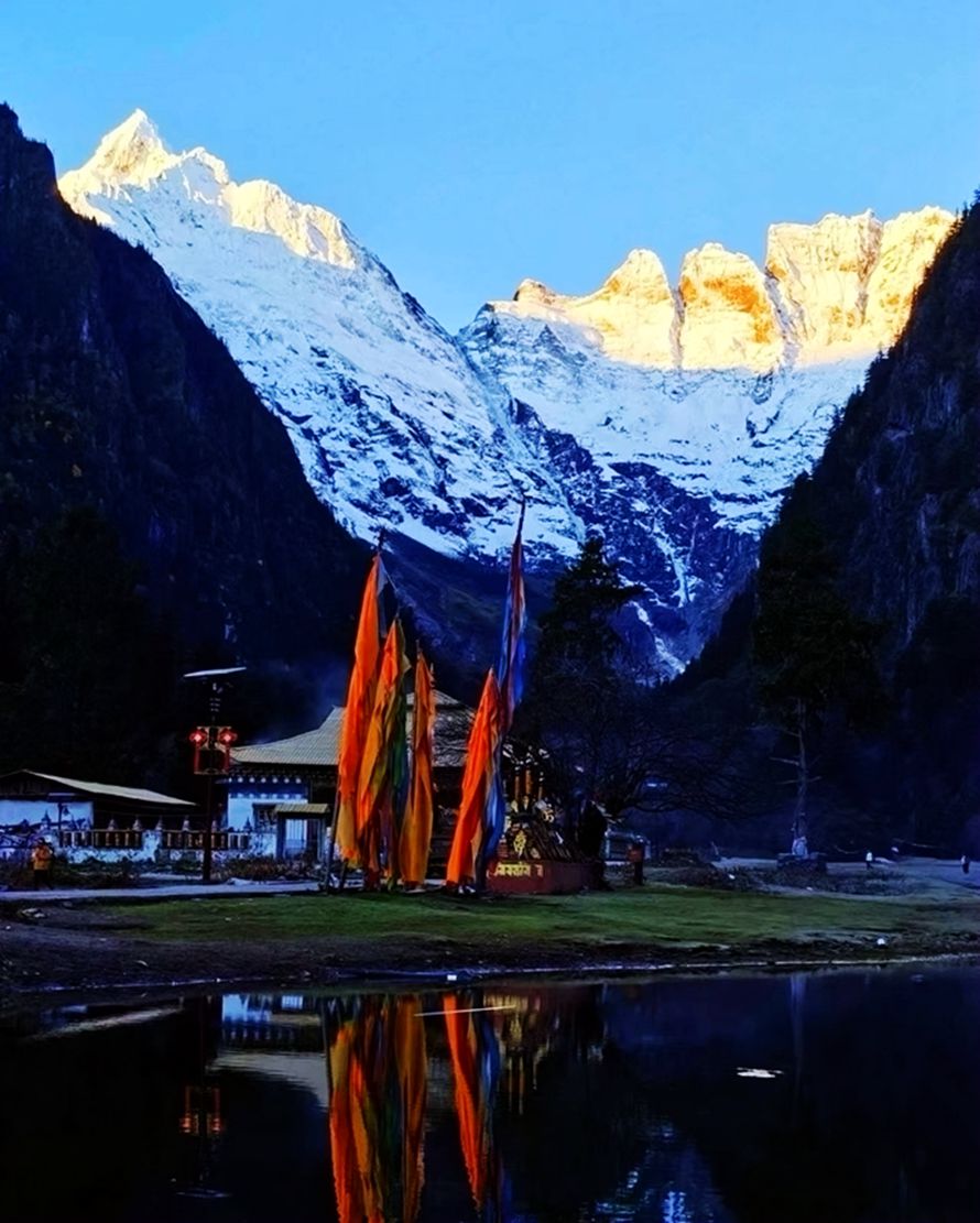 早晨6:00分起来,拍摄难得一见的【梅里雪山日照金山】奇观,飞来寺观景酒店是拍摄梅里雪山最佳的位置,从这里你将领略藏区八大神山之首,世界最美的雪山之一,神圣的梅里十三峰。20分钟里金光映照的梅里雪山光芒万丈美不胜收(据藏民所说,日照金山是有缘人方可看到,看到后会幸运一整年)。看完日照金山奇观,驱车经过澜沧江大桥,2小时后抵达西当村,乘坐景区越野车抵达世外桃源——【雨崩村】(此段越野车费200元/人已含)。入住后,启程前往【神瀑】,神瀑位于云南德钦县云岭乡境内的卡瓦博格峰南侧,有悬岩倾泻而下的瀑布,被称为“雨崩神瀑”,藏族人以到雨崩神瀑下沐浴作为一种洁净心灵的修炼。“雨崩”,意为经书,其名与离村不远的“石篆天书”胜境不无关系。是梅里雪山上海拔最高的一个村寨。雨崩神瀑景色随季节变化而变化。春夏冰雪消融,瀑布水流增大,落入地面,溅沫飞扬,雨季瀑布较为壮观,平时只是山上垂下如哈达般千丝万缕的水线。据说雨崩瀑布是卡瓦格博尊神从上天取回的圣水,能占卜人的命运,还能消灾免难,赐恩众生。藏传佛教信徒朝拜梅里雪山,必定沐浴雨崩圣瀑。阳光斜射升腾,游人穿瀑而过能见彩虹绕身。秋冬时节,水流变小,山风过处,有时凌空掷地,有时贴壁泻下,变幻万千,远观如素帛飘飞,近看似明珠垂落。朝圣者视瀑布为圣水,争相沐浴、饮用,还盛入瓶中带回家中供奉。下午两点开始返回,于黄昏六点钟左右返抵雨崩上村。